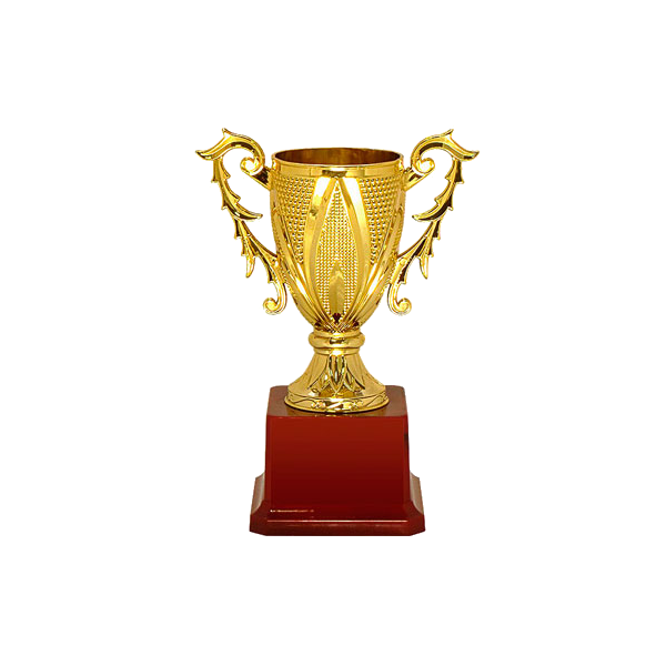Кубок призовой высотой 190 мм изготовлен из пластика с золотым напылением. Выполнен в форме чаши с двумя фигурными ручками. Крепится к пластиковому основанию коричневого цвета.