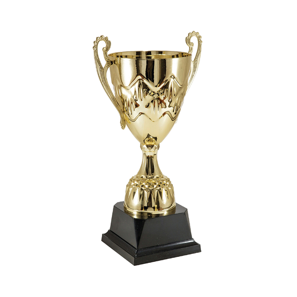 Высота кубка 420 мм. Чаша изготовлена из металла, диаметр 160 мм., украшена рельефным узором и фигурными ручками. Массивная ножка из пластика. Крепится к пластиковому основанию чёрного цвета.