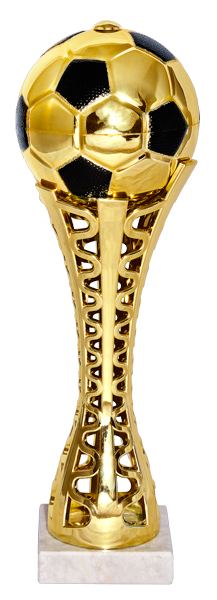 Оригинальный наградной кубок, выполнен из пластика, высотой 290 мм. Изготовлен в форме футбольного мяча на стеле. Крепится к мраморному основанию серого цвета.